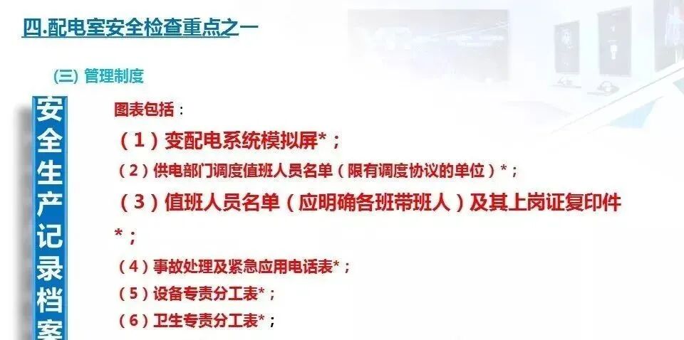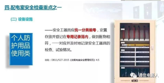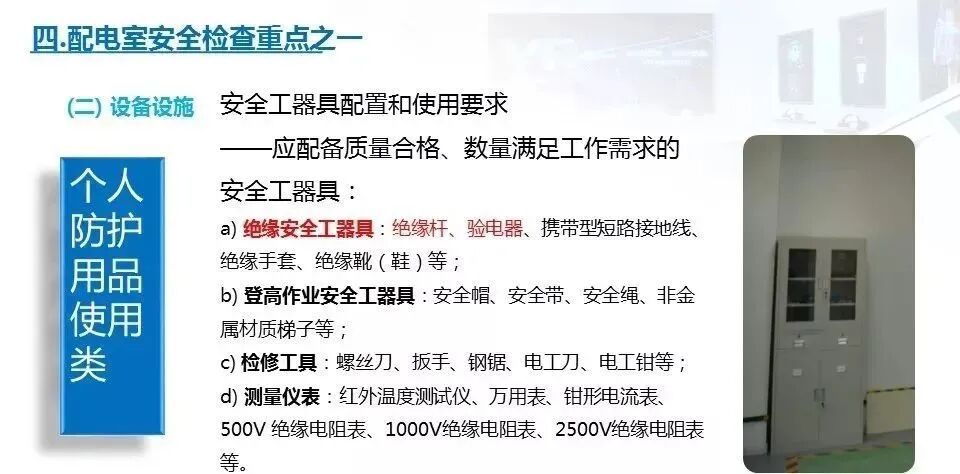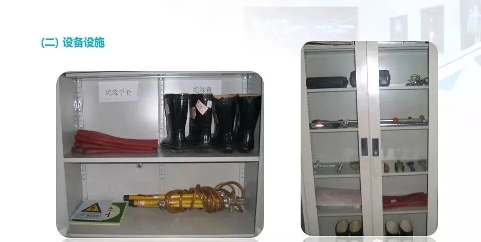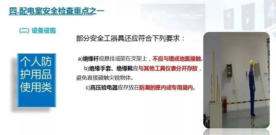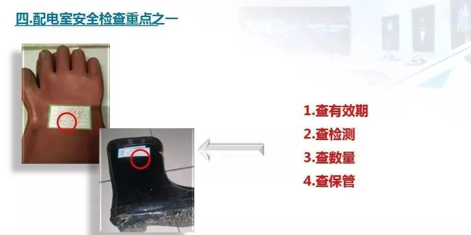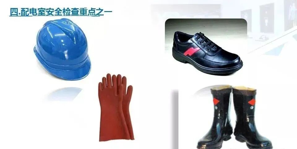 11.检查配电房是否配备了绝缘棒、绝缘手套、绝缘鞋等防护用品,以及是否配备了应急照明灯具和灭火器材、备有“禁止合闸,有人工作”的标识牌。