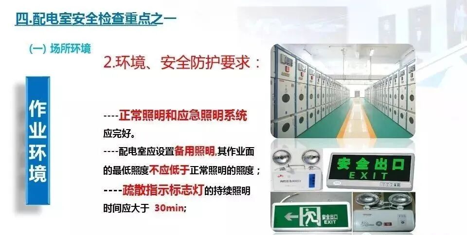 如果配电室在夜间发生安全事故,急需立即抢修时,应急安全照明就是抢修人员工作的第一条件。