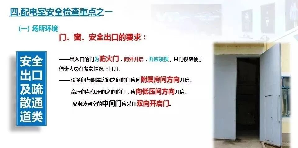 3.检查配电房的门是否为防火门并按规定向外开启。